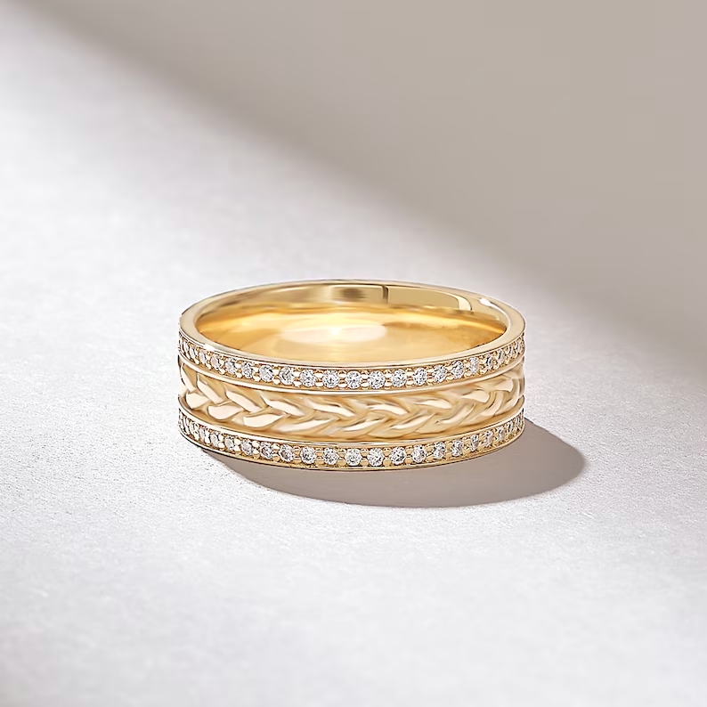 14K純金編織小麥色結婚戒指,密鑲0.96克拉天然鑽石(GH色,VS-SI淨度)。 GIA認證。