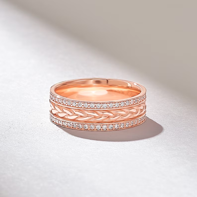 密鑲天然鑽石配對聯盟 | 編織小麥平頂結婚戒指女士