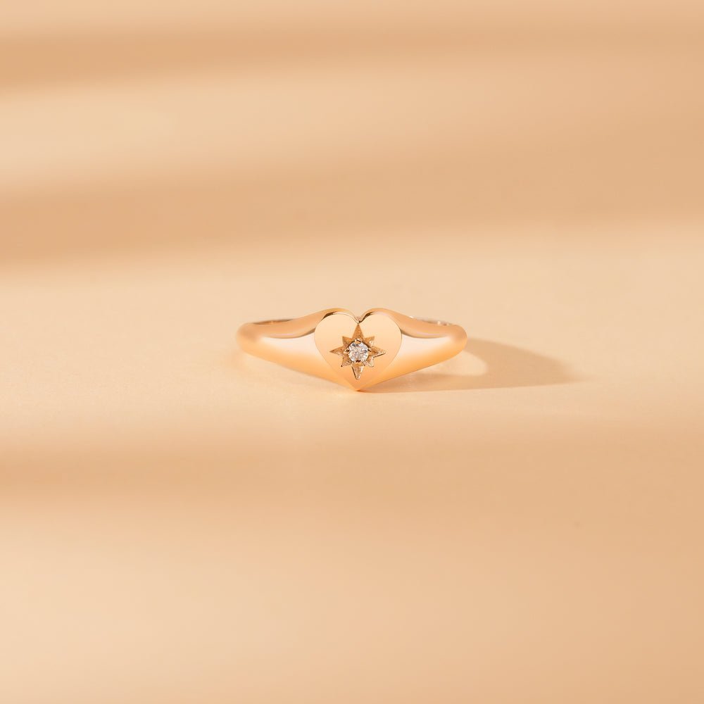 14K金心形印章戒指,鑲嵌一顆0.03克拉天然鑽石星光閃耀。可選黃金、白金或玫瑰金款式。 BIS和GIA認證。
