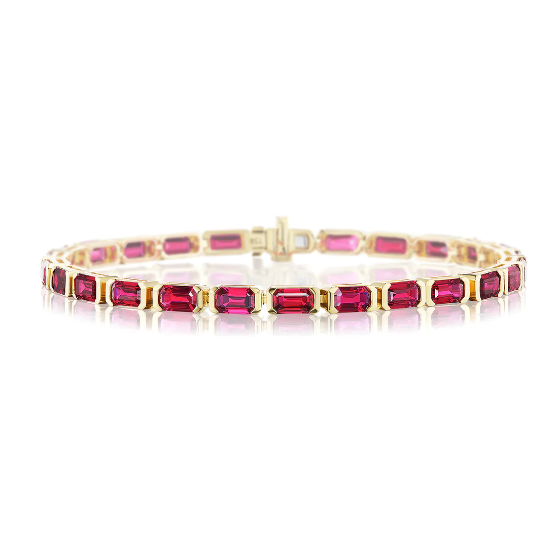 這款手鍊鑲嵌43顆祖母綠切割紅寶石,總重7.23克拉。紅寶石東西向鑲嵌的設計賦予了這款經典網球手鍊現代感,使其與眾不同。紅寶石的深紅色調散發著經典奢華的魅力,而光滑的切割工藝也最大限度地展現了寶石的光芒。