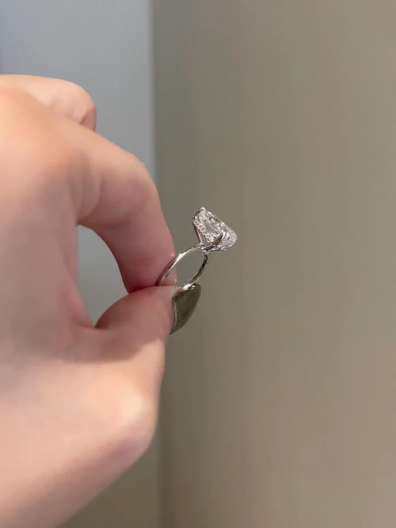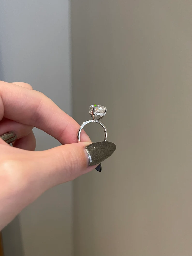 三爪鑲嵌不僅能固定莫桑石,還能展現其美麗的光彩,而隱藏的光環則為戒指增添了神秘感。