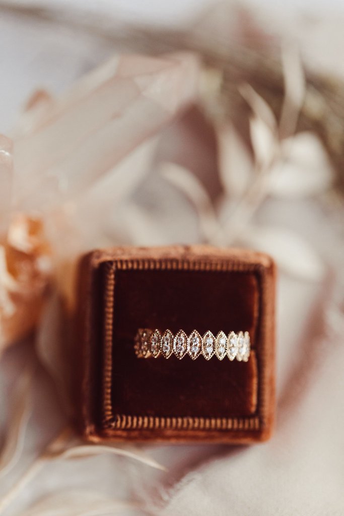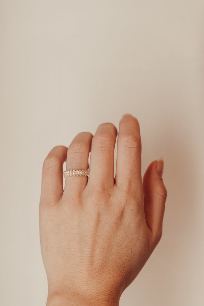 這款欖尖形鑽石戒指具有精緻的偏頭痛邊緣和閃閃發光的鑽石 - 非常適合復古魅力和優雅的疊戴或單獨佩戴。