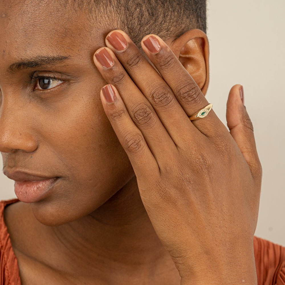 14K純金祖母綠與天然鑽石邪眼戒指