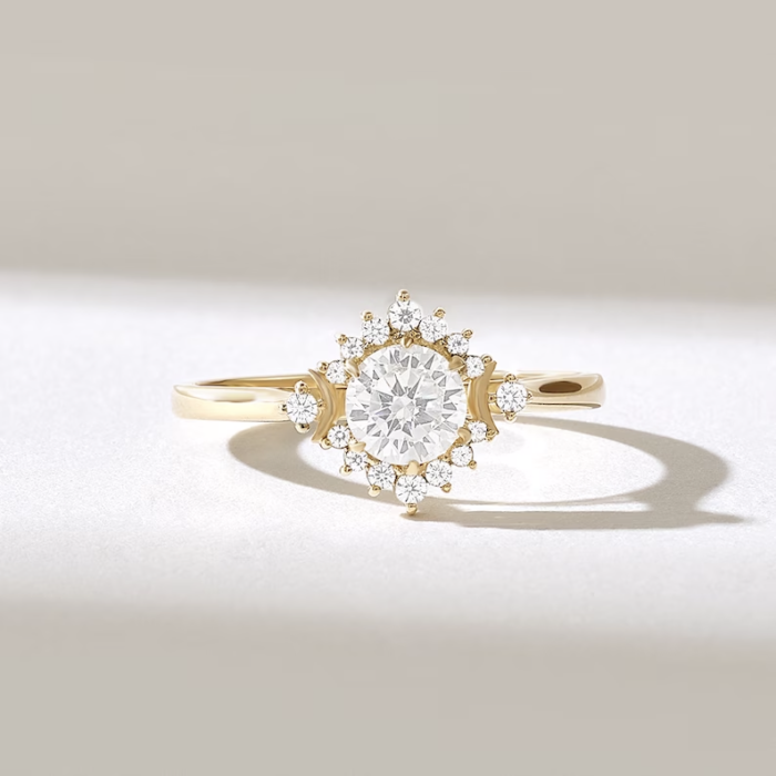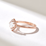 這款莫桑石雪花戒指採用 18k 純金打造,具有精緻的自然風格設計,非常適合作為異想天開的訂婚戒指或承諾戒指。