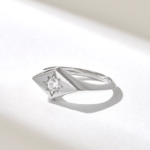 獨特的 菱形頂部 (8.06 毫米 x 13.68 毫米)具有 北極星圖案 裝飾有 微小的天然鑽石,提供恰到好處的閃耀 總重量 0.12 克拉 的 GH 顏色,VS-SI 淨度 鑽石。精湛的工藝,以及 頻寬 1.87 毫米 和 厚度1.31毫米,確保舒適的貼合度,同時保持其視覺吸引力和象徵深度。