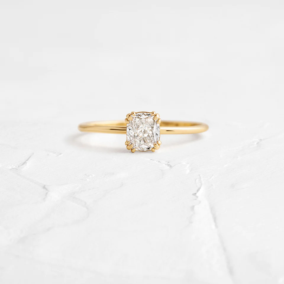 這款螺紋戒指以簡約的鑲嵌方式突出了一顆 0.5 克拉的矩形墊形切割鑽石,將永恆的光彩與現代、簡潔的輪廓融為一體。