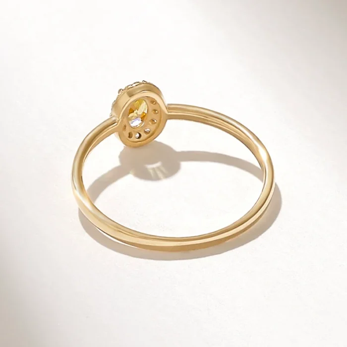 這款精美設計的中心是一顆璀璨奪目的橢圓形黃水晶,重達0.11克拉,散發著溫暖的黃色光澤,周圍環繞著一圈璀璨奪目的鑽石。 0.06克拉的DEF色澤和VVS淨度的鑽石,為這枚戒指增添了額外的優雅氣息。戒圈頂部直徑7.60毫米,戒圈本身寬度1.65毫米,厚度1.30毫米,配戴舒適時尚。