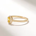璀璨的 14K 純金戒指,中心鑲嵌一顆橢圓形黃水晶,周圍點綴著閃閃發光的鑽石,可為任何裝扮增添溫暖和優雅。