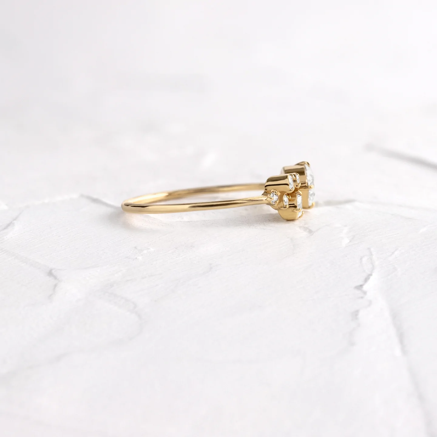 這款戒指鑲嵌著一系列令人驚豔的鑽石,均經過精心挑選,品質卓越,美不勝收。這些鑽石擁有IJ色澤和VS-SI淨度等級,閃耀奪目,為整枚戒指增添一抹精緻優雅。在鑲嵌過程中,鑽石經過專業打磨,以凸顯其自然光澤,使每個刻面都優雅地捕捉光芒。