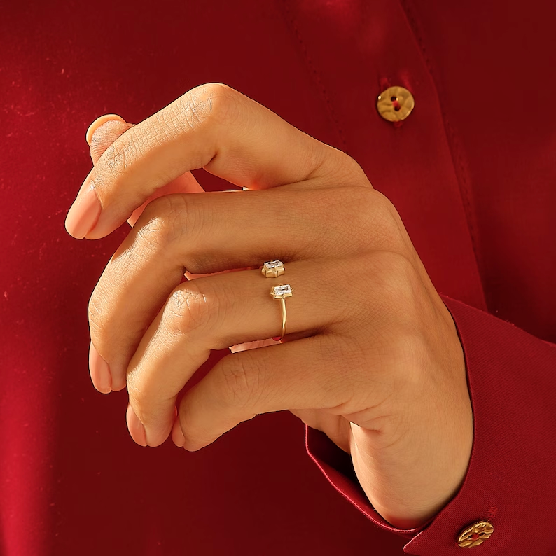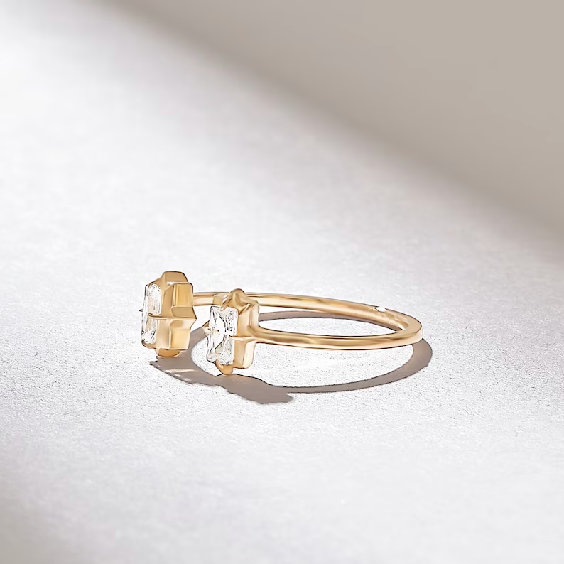優雅、現代、簡約—— 天然鑽石開口袖口可調式戒指 專為注重多功能性和風格的當代女性而設計。手工製作 14K純金這款獨特的戒指採用開放式袖口設計,兩端各鑲嵌一顆細小的長方形切割天然鑽石,形成微妙的正面間隙,為永恆的結婚戒指輪廓增添了現代氣息。