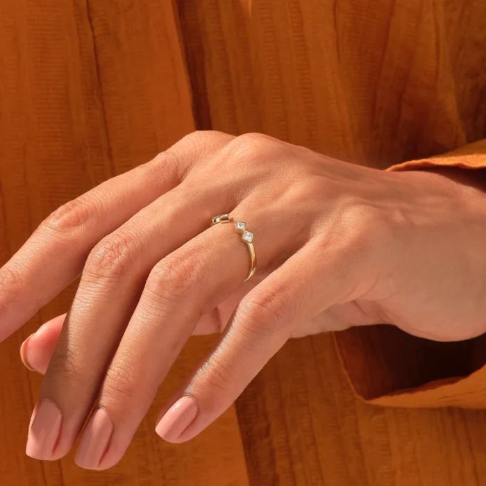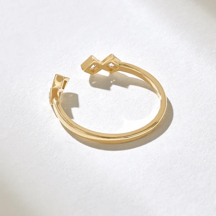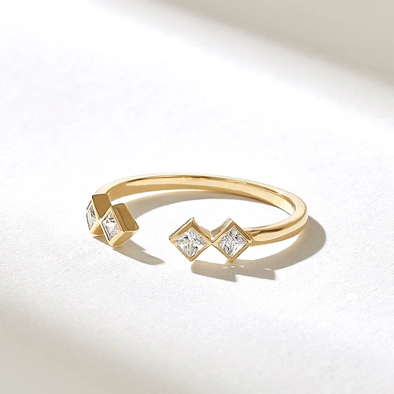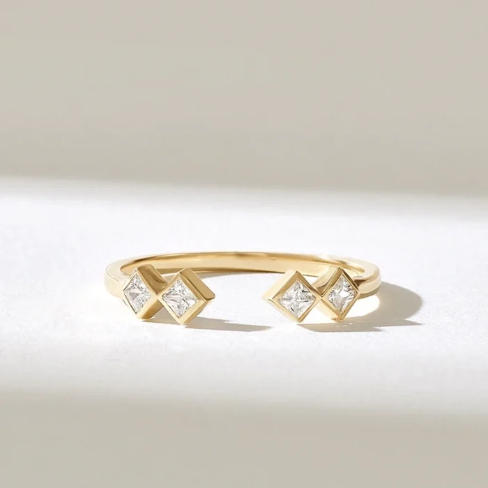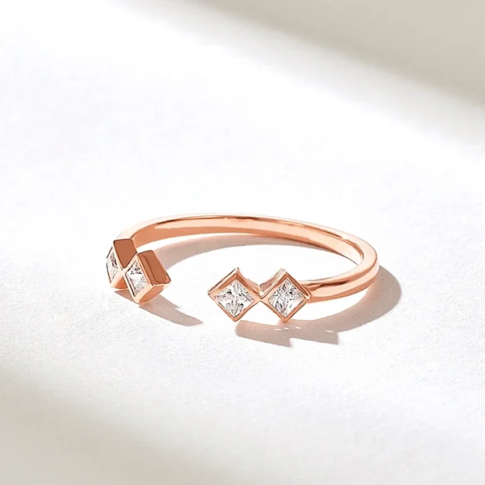 大膽的幾何形狀與精緻的優雅相結合 天然鑽石鏤空方形戒指,以現代手法演繹經典鑽石戒指,令人驚艷。 14K純金,這款開口結婚戒指具有一系列獨特的 包鑲公主方形切割天然鑽石,框框在乾淨的方形開口內,營造出時尚的建築感。 白金、玫瑰金或黃金,專為欣賞簡約主義和精緻細節的女性而設計。