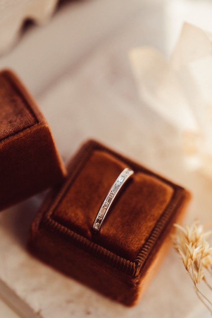 每顆鑽石都經過精心鑲嵌,邊緣飾有精緻的粒紋細節,更添復古質感和精緻魅力。鑽石 GH 顏色 和 VS-SI 淨度,確保每一眼都閃耀著璀璨的火彩和清晰度。