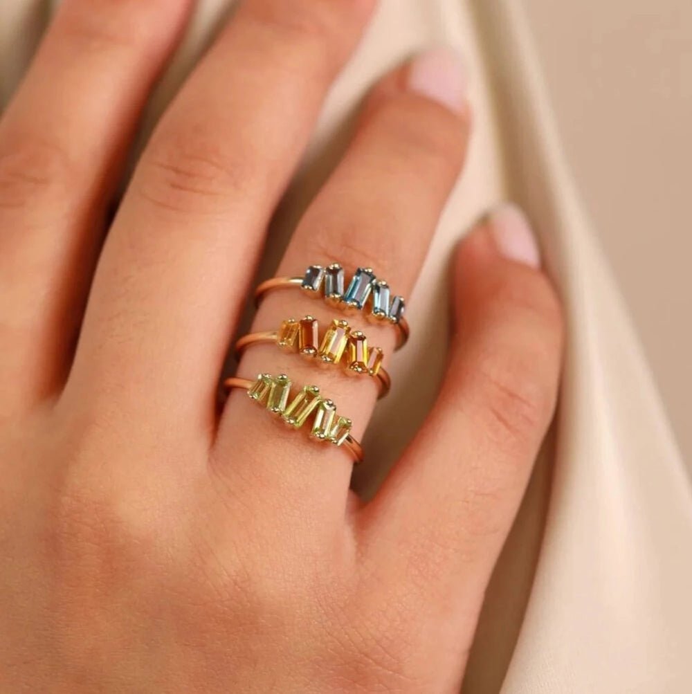 長方形橄欖石群鑲戒指大膽而鮮豔,非常適合增添一抹色彩。