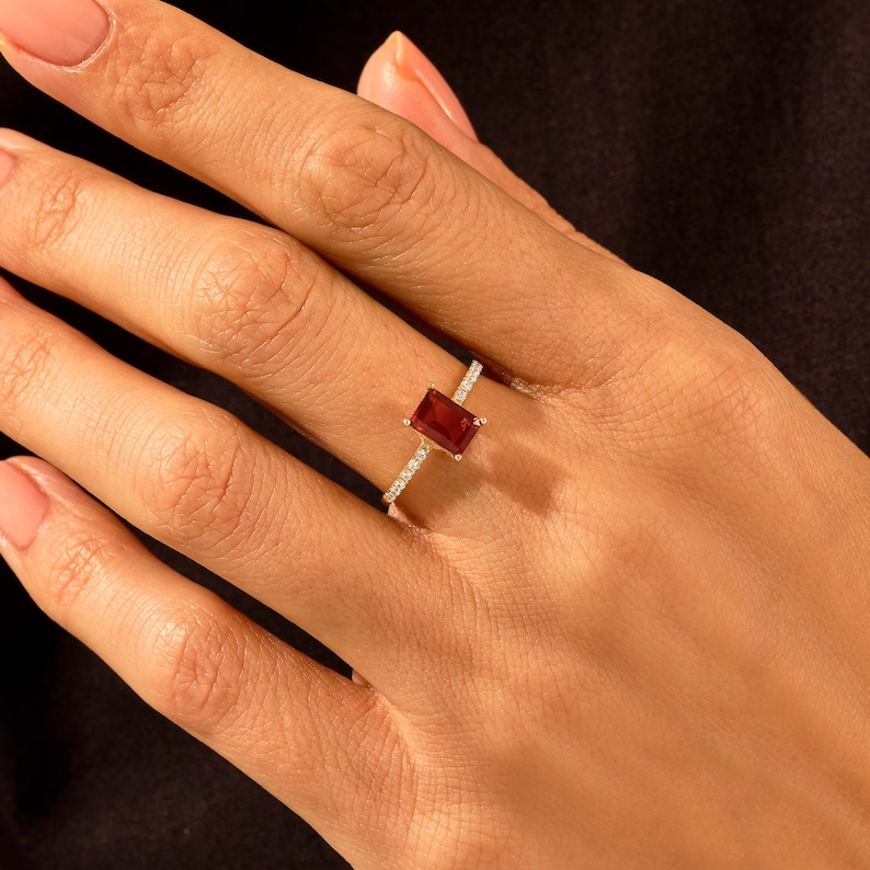 這令人驚嘆的 14K 純金長方形石榴石鑽石單石戒指  璀璨的紅色石榴石與優雅的鑽石點綴相得益彰。這款14K純金戒指有白金、玫瑰金和黃金三種款式可選,確保與任何風格完美搭配。