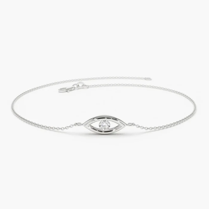 這款 14K 純金實驗室合成鑽石邪眼手鍊設計時尚,有白金、玫瑰金和黃金三種顏色可選。經 BIS 認證,品質保證,兼具時尚與保護。這款手鍊非常適合送禮或收藏,10-12 個工作天內出貨。您可以透過線上聊天和視訊通話獲得客服支持,享受個人化的購物體驗。