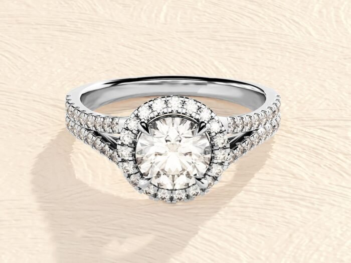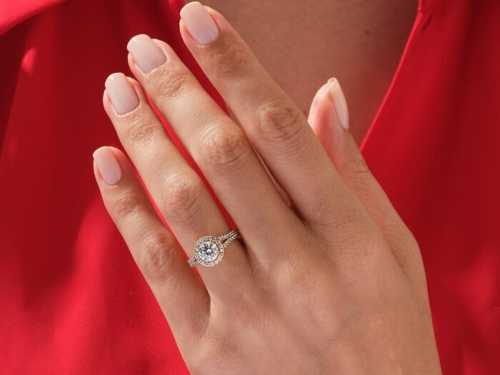 這枚戒指的品質非常優秀。鑽石晶瑩剔透,切割精良,光環的設計也十分優雅。