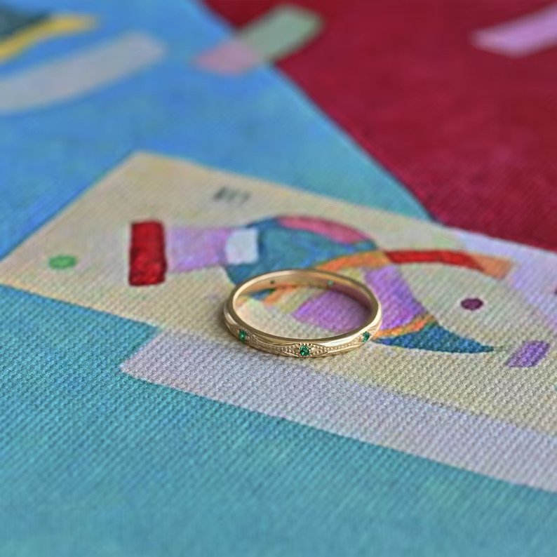 用濃鬱優雅的 14k 純金裝飾藝術風格祖母綠結婚戒指, 一枚美麗的寶石戒指,採用優質 14K 金打造,具有精緻的裝飾藝術風格設計,經典精緻與現代前沿相平衡,戒指寬度為 2.26 毫米,厚度為 1.57 毫米。