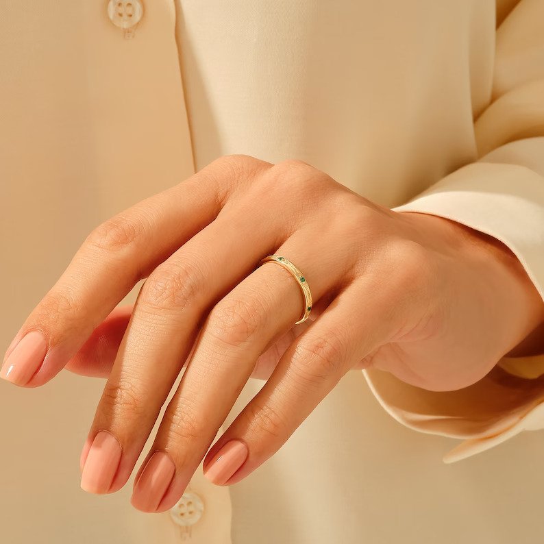 優雅的 14K 純金結婚戒指,帶有裝飾藝術細節和鮮豔的祖母綠——具有復古魅力、大膽的對稱性和永恆的美麗。