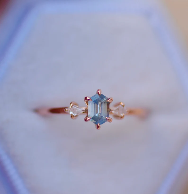 14K 純金六角形淺藍色藍寶石和鑽石訂婚戒指