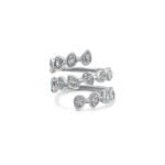 戒指的環繞式設計不僅配戴舒適,更營造出令人驚豔的視覺效果。光滑的金色戒圈優雅地環繞指尖,而間隔排列的包鑲設計則更凸顯鑽石的淨度和璀璨。
