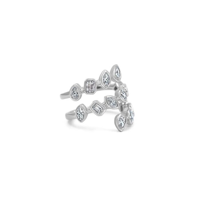 這款非凡的戒指鑲有0.78克拉的合成鑽石,每顆都採用包鑲工藝精心鑲嵌。鑽石切割成各種形狀,包括圓形、公主方形和欖尖形,使每顆寶石都能展現各自的光芒,同時為戒指的整體造型增添光彩。包鑲工藝提升了鑽石的可見度,並為傳統的包鑲款式增添了現代感。