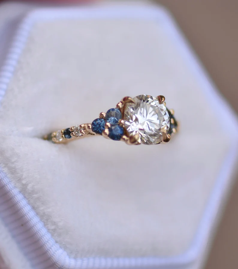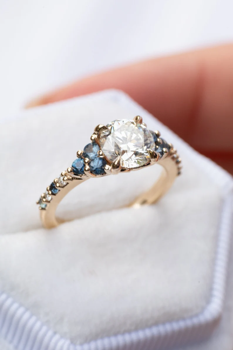 14K黃金天然鑽石和藍寶石訂婚戒指 | 花卉訂婚戒指