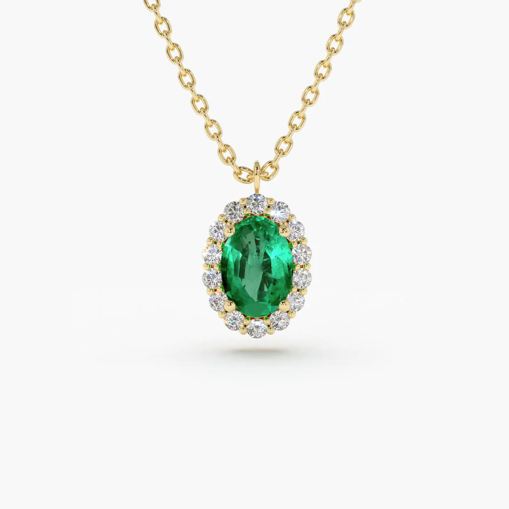 這 14K 純金橢圓形切割祖母綠光環鑽石項鍊 散發出一種時間無法磨滅的優雅。