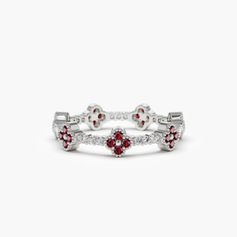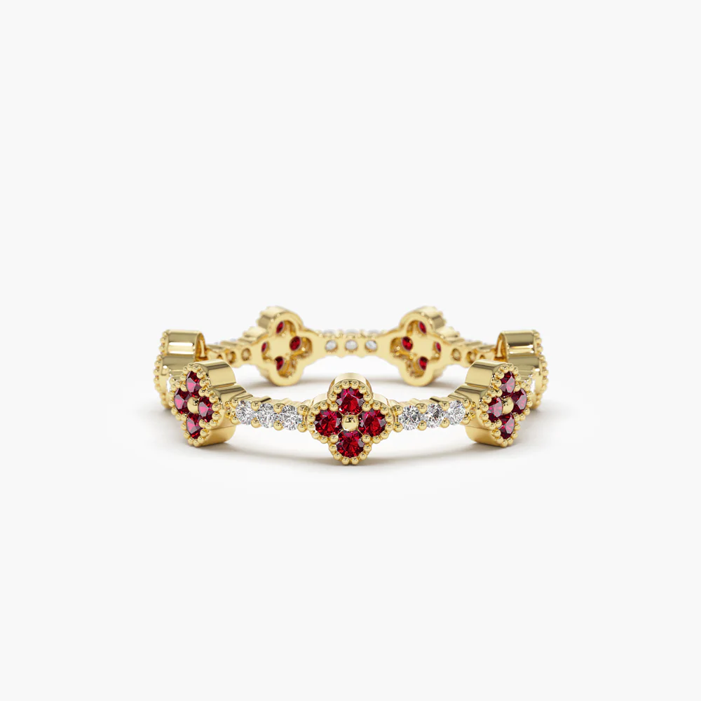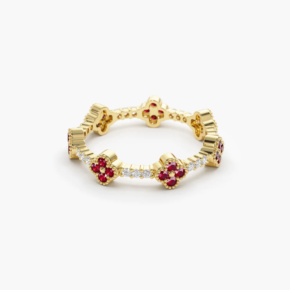 令人驚嘆的 14K 純金永恆戒指,鑲有三葉草形狀的紅寶石和鑽石,提供永恆而充滿活力的設計,象徵著永恆的愛情。