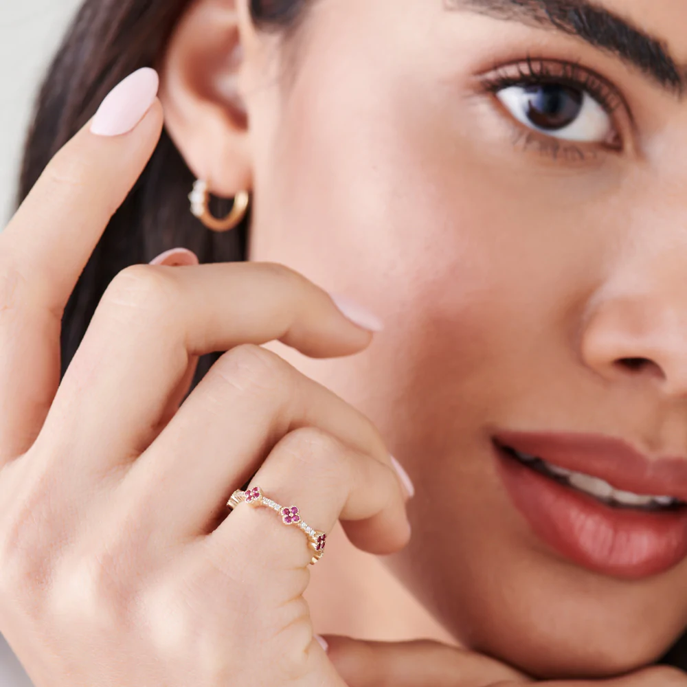 14K 純金永恆四葉草紅寶石與鑽石戒指