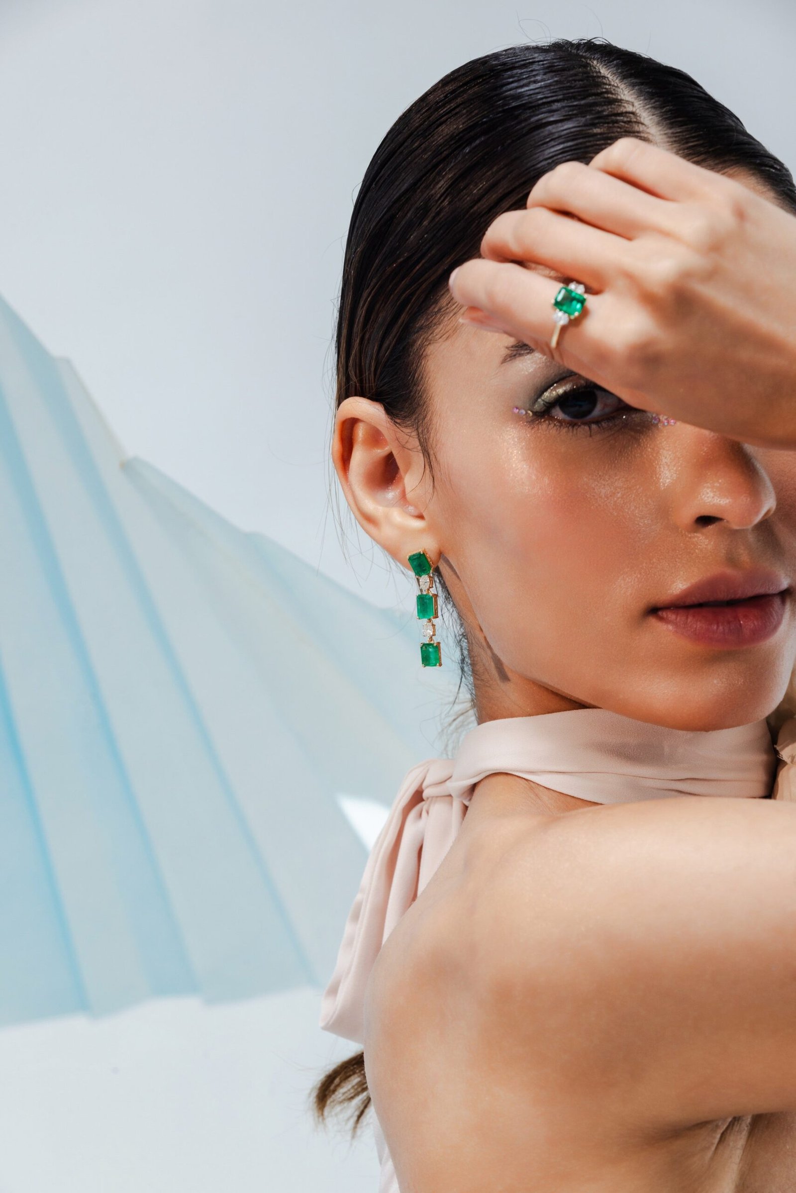 這款三石祖母綠和鑽石戒指令人驚艷,優雅而永恆。