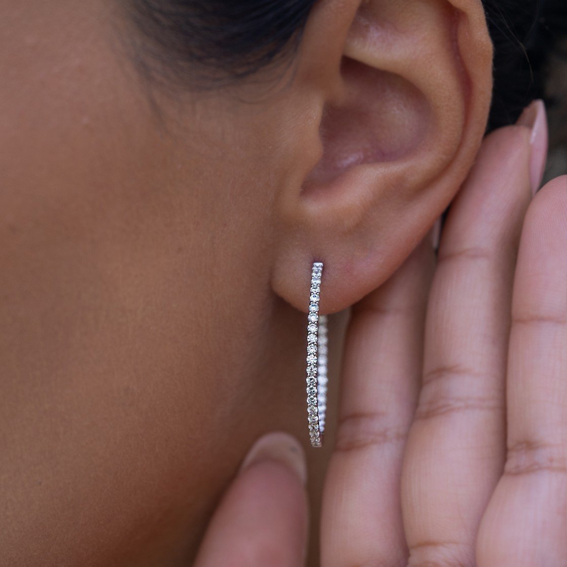 這款優雅的中型橢圓形耳環鑲嵌著1.10克拉璀璨莫桑石鑽石,每顆均擁有D色和VVS1淨度的卓越品質。莫桑石鑽石的卓越亮度和火彩賦予這款耳環迷人的光芒,無論是日常佩戴還是出席特殊場合,都堪稱完美之選。