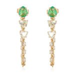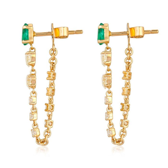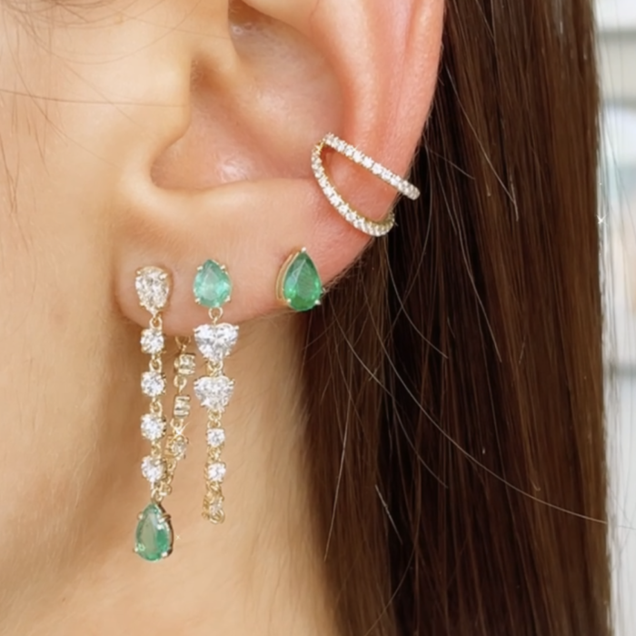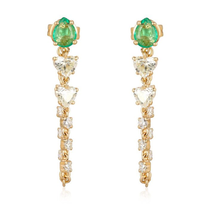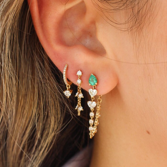 為您的珠寶收藏增添一絲優雅和浪漫氣息 14K金莫桑石鑽石鏈祖母綠心形環形耳環。這對精緻的 令人驚嘆的心形祖母綠,象徵愛和永恆的美麗,精緻地懸掛在 閃閃發光的莫桑石鑲鑽鏈 優雅的環形設計。鏈條的流暢動感,更襯托出祖母綠和鑽石的璀璨光芒,營造出奪目精緻的造型。