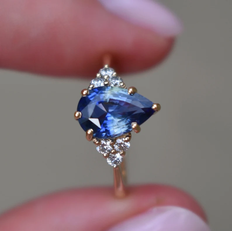 - 主石: 天然雙色藍寶石(1.5-1.8克拉,梨形)