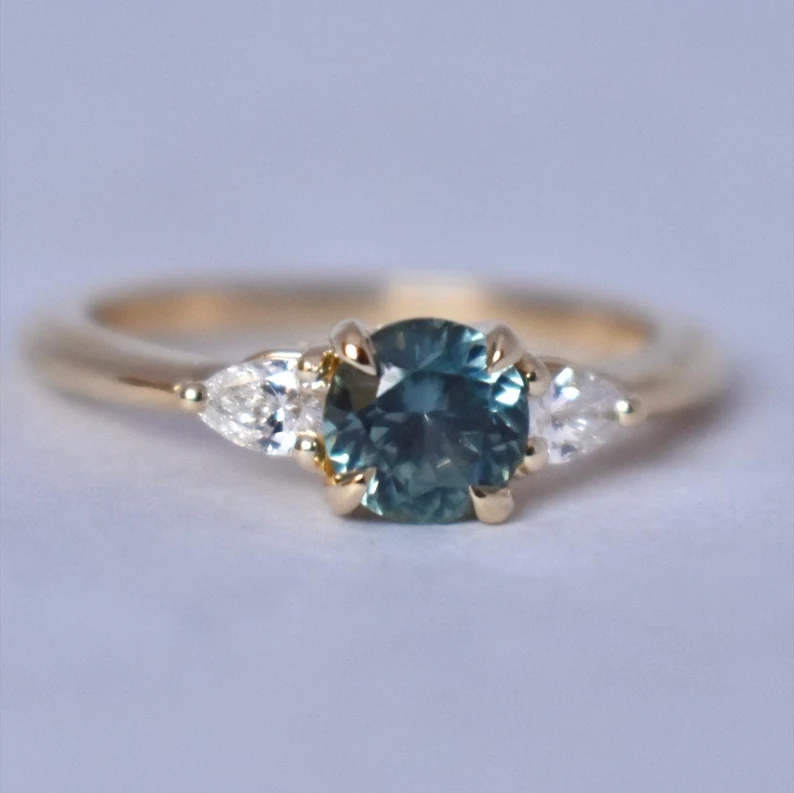 14K金藍綠色蒙大拿藍寶石天然鑽石訂婚戒指