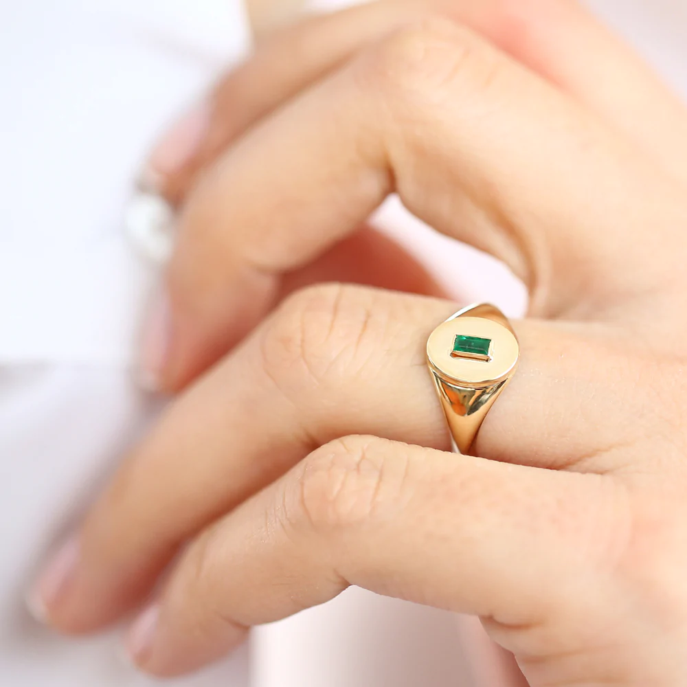 精緻的 14K 純金印章戒指,鑲嵌有長方形切割祖母綠,設計獨特而優雅,彰顯大膽風格。