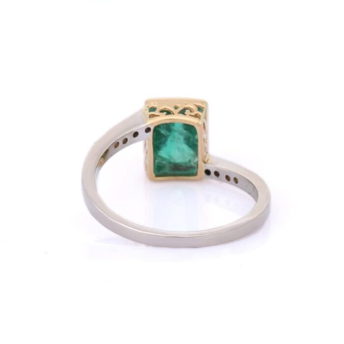 這枚戒指的中心鑲嵌著一顆璀璨奪目的長方形切割祖母綠,重達2.30克拉。這顆祖母綠以其深邃的綠色和長方形的造型而聞名,採用爪鑲工藝,不僅提升了寶石的璀璨度,更使光線能夠照亮其各個刻面。祖母綠周圍環繞著8顆璀璨鑽石,總重0.10克拉,為祖母綠的鮮綠色增添了一抹璀璨的光芒,與祖母綠的鮮綠色形成鮮明對比。