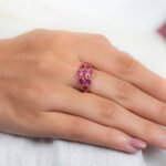 這款戒指採用優質14K純金打造,溫暖璀璨的鑲嵌工藝,更襯托出紅寶石的鮮豔色彩。華美的金戒圈與寶石相得益彰,形成和諧的對比,更凸顯其自然的璀璨光芒。九顆紅寶石精心排列成橢圓形,打造出精緻奪目的設計,展現個性魅力。