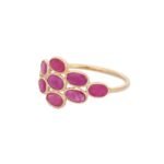 用迷人的 14K純金紅寶石戒指,一件將優雅與大膽完美融合的作品。這款非凡的戒指鑲嵌著九顆橢圓形紅寶石,總重2.40克拉。每顆紅寶石尺寸為5 x 3毫米,以其迷人的紅色調而聞名,象徵著激情與活力。