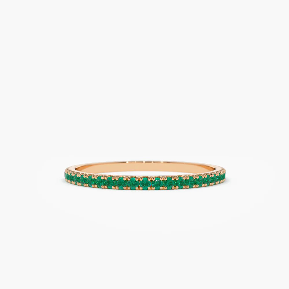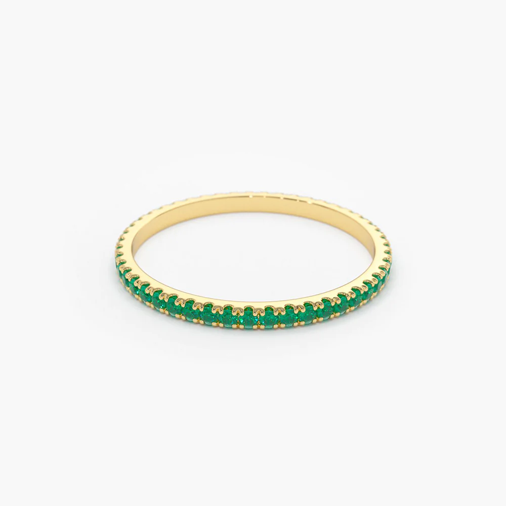 這款精美的永恆戒指鑲嵌著56顆圓形祖母綠,每顆直徑1.2毫米,經過精心鑲嵌。祖母綠的鮮明綠色與閃耀的黃金形成鮮明對比,為您的珠寶收藏增添一抹色彩與優雅。微密釘鑲嵌技術確保每顆寶石都牢固地鑲嵌在位,同時最大限度地展現其璀璨的光芒。