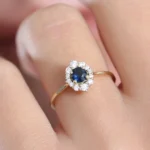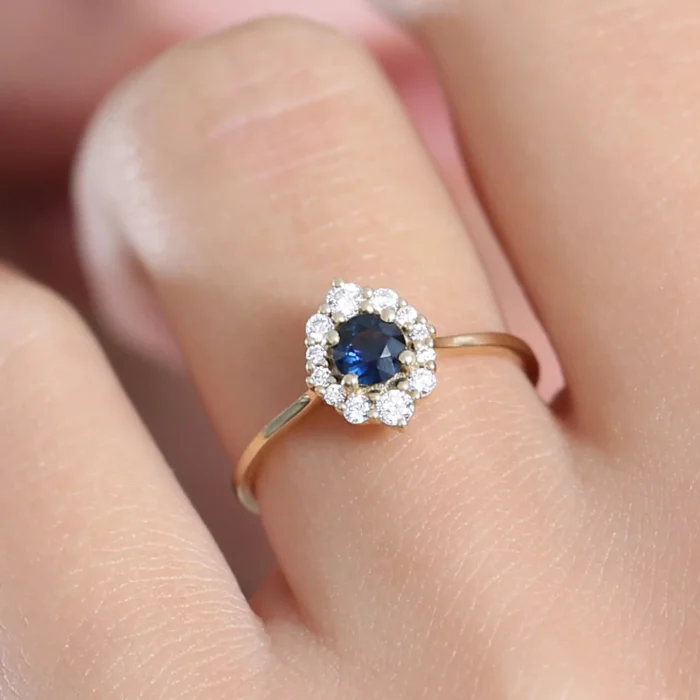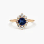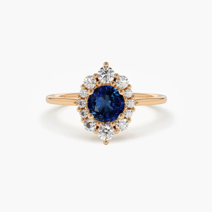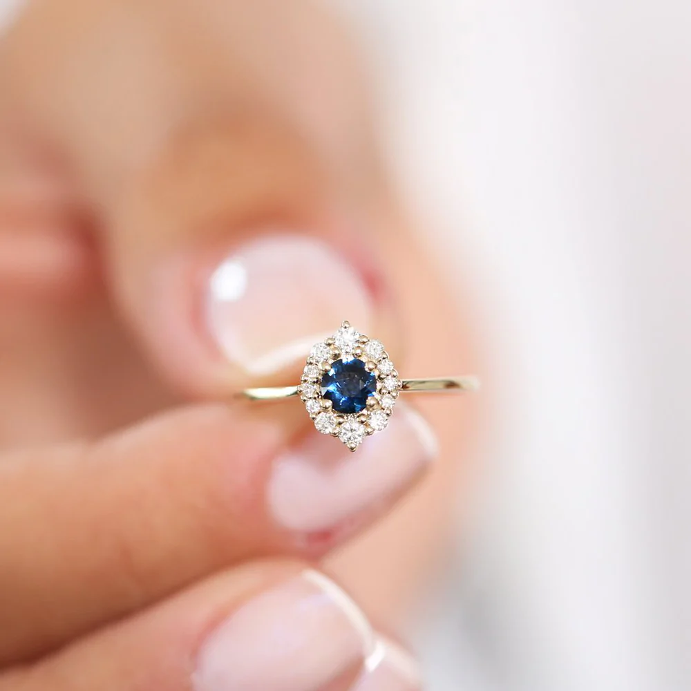 14K 純圓形藍寶石光環鑽石訂婚戒指