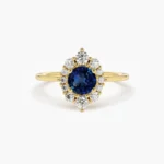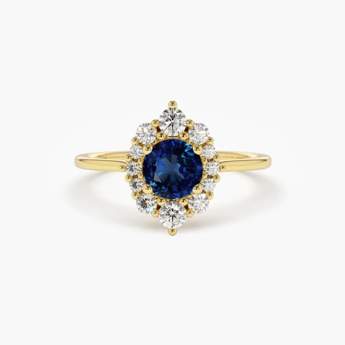 用 14K 純金圓形藍寶石和鑽石訂婚戒指.
