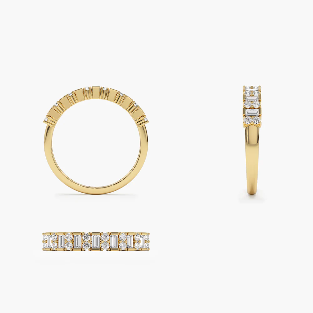 14K 純金垂直長方形鑽石和圓形鑽石結婚戒指