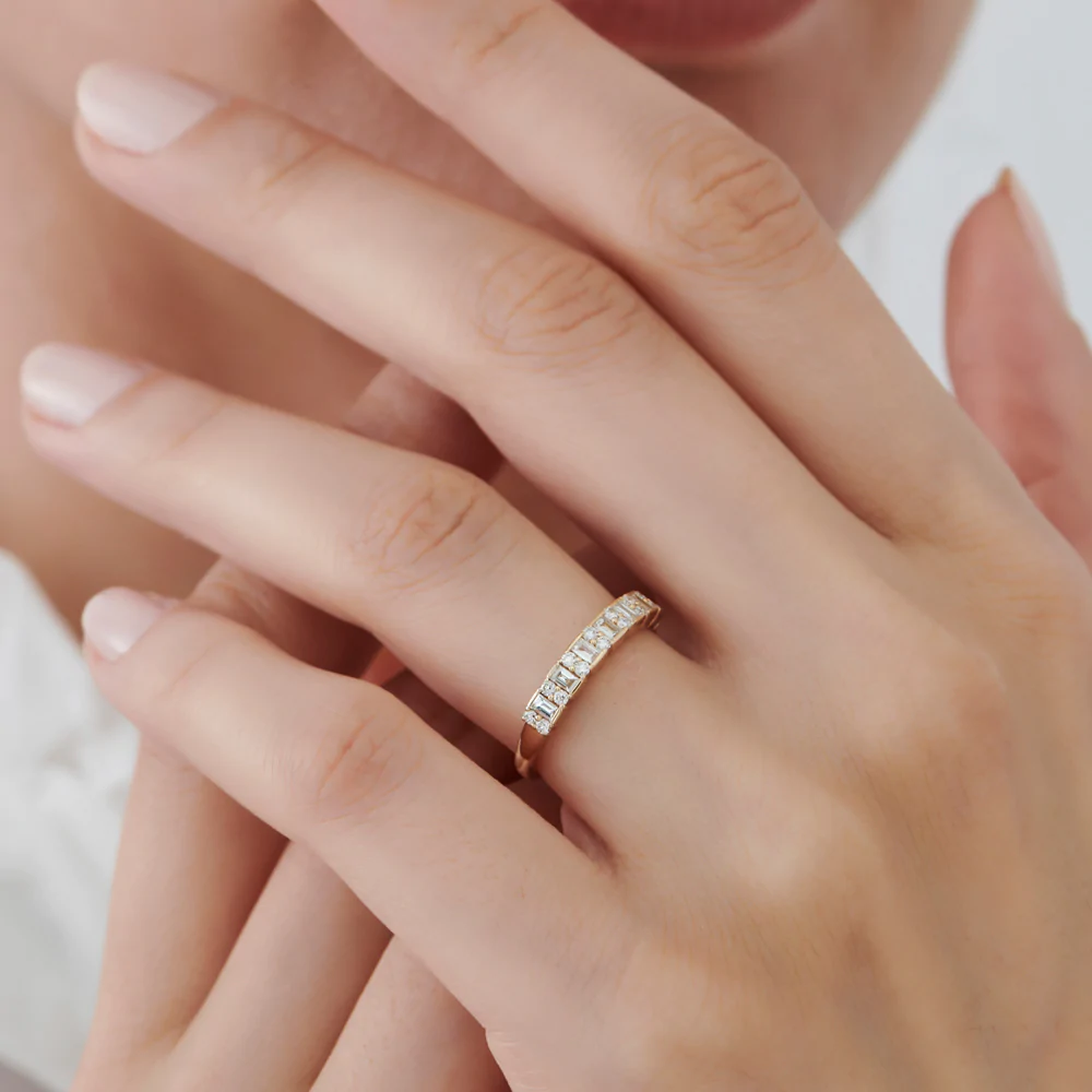 這款華麗的戒指採用優質14K金打造,兼具耐用性和優雅氣質。戒指設計和諧,鑲嵌16顆1.4毫米圓形莫桑石鑽石和7顆2.5 x 1.5毫米長方形鑽石。這種排列方式營造出令人驚嘆的形狀與璀璨光芒的交相輝映,適合任何場合佩戴。