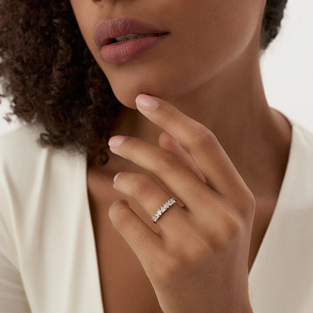 獨特的上下鑲嵌設計,將每顆心形鑽石展現得淋漓盡致,飽含愛意與團結。這款戒指既可作為絕佳的浪漫禮物,也可作為週年紀念戒指,亦可為您的珠寶收藏增添一抹獨特的魅力。