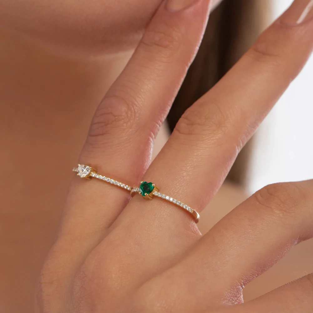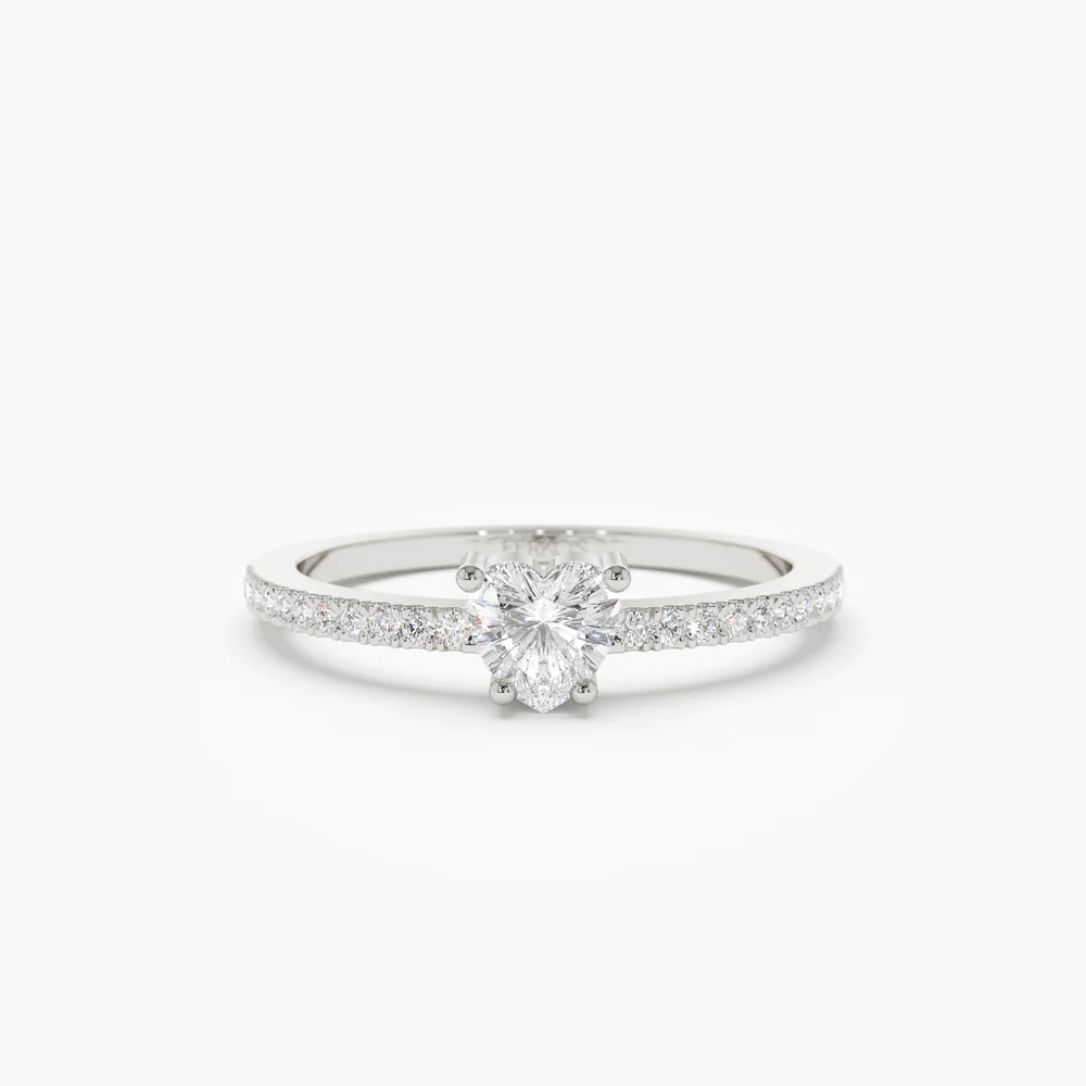 這枚優雅戒指的中心是一個 璀璨的心形天然鑽石 (4毫米),象徵愛與忠誠。它與 22顆圓形天然鑽石 (每顆 1.10 毫米),鑽石總重量為 0.40克拉. 所有寶石均為 GH 顏色和 VS-SI 淨度,確保光彩奪目、品質卓越。