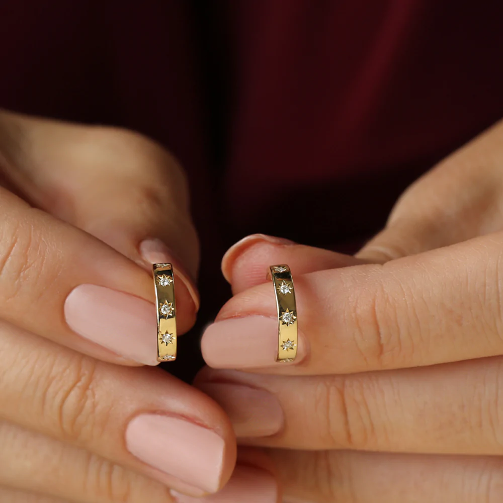 14K 星形鑲嵌簡約天然鑽石環 散發永恆的優雅 12顆閃亮鑽石 總計 0.14 克拉. 製作於 14K純金,這些箍可用 白色,玫瑰色, 或者 黃金. 認證 BIS 標記,他們運送 10-12個工作天 擁有專門 客戶支援 透過即時聊天和視訊通話。