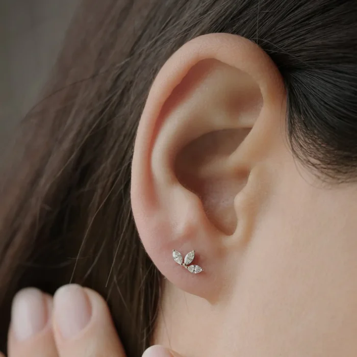 兩隻耳環共鑲嵌六顆欖尖形鑽石:四顆尺寸為3.75 x 2毫米,另外兩顆尺寸較大,尺寸為4 x 2毫米。欖尖形切割鑽石擁有獨特的形狀,閃耀奪目,共同構成一幅璀璨奪目的畫卷,展現璀璨光芒與優雅氣質。耳環總重0.38克拉,閃耀奪目,光彩奪目。