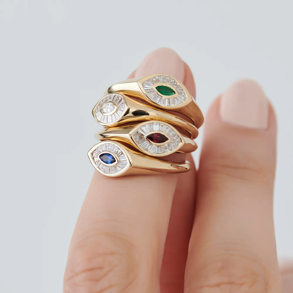 這款作品將色彩與幾何圖形優雅地融合,是特殊場合、週年紀念或作為訂婚戒指的完美選擇。無論單獨配戴或與其他可疊戴的戒指搭配,其獨特的欖尖形與長方形切割組合都既彰顯精緻,又不失現代氣息。