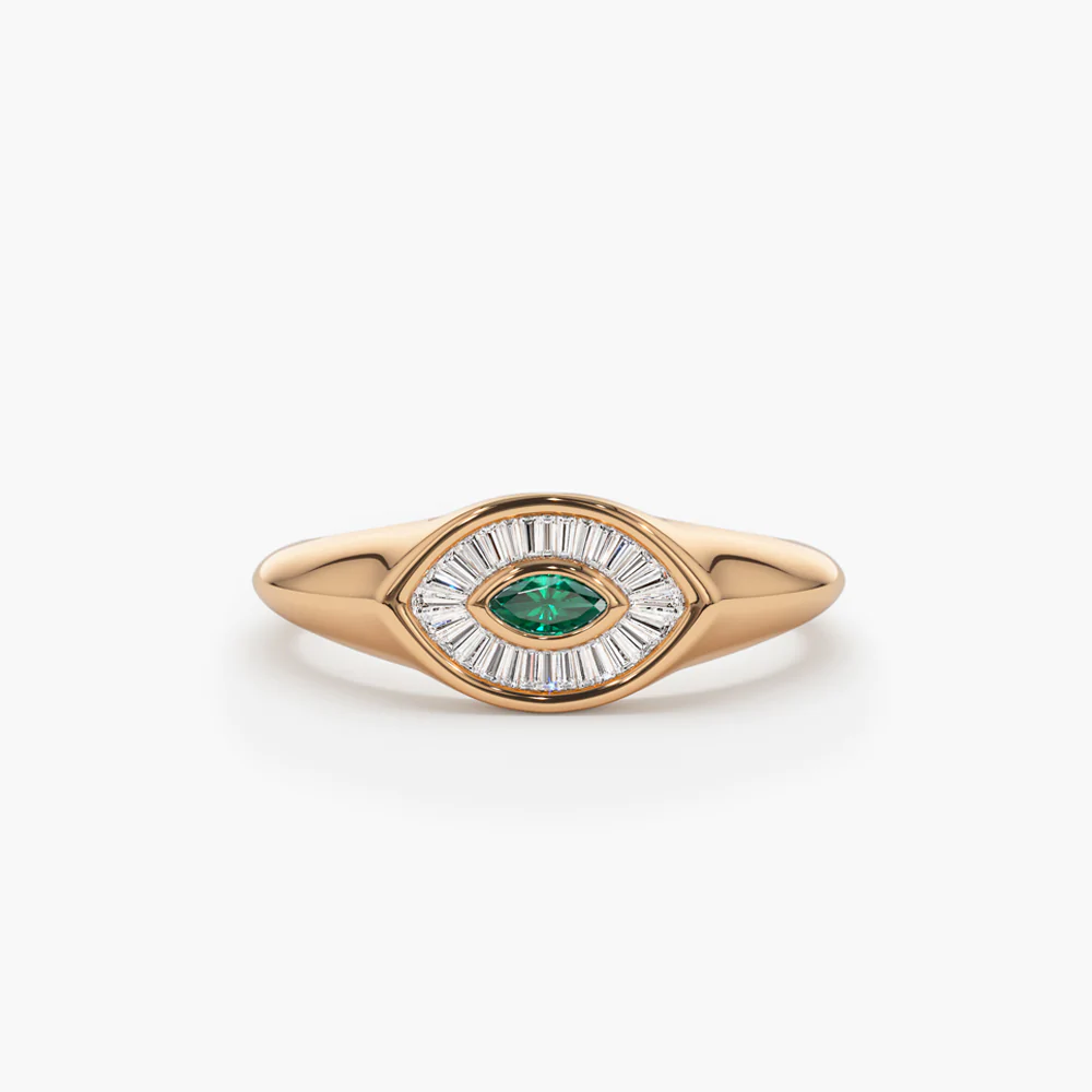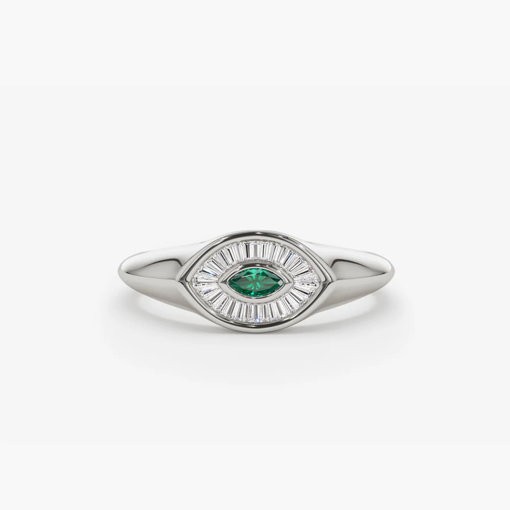 可用 白金、玫瑰金和黃金,這枚戒指突出了 4x2毫米欖尖形祖母綠 稱重 0.08克拉,呈現出一抹鮮豔的綠色,象徵新生和愛情。祖母綠周圍環繞著 18顆長方形鑽石 (1.5–2x1毫米)和 18顆圓形鑽石 (120 萬),總計 鑽石重量0.26克拉. 所有鑽石均經過精心挑選, GH 顏色和 VS-SI 淨度,確保非凡的光芒並與祖母綠的深綠色色調和諧。