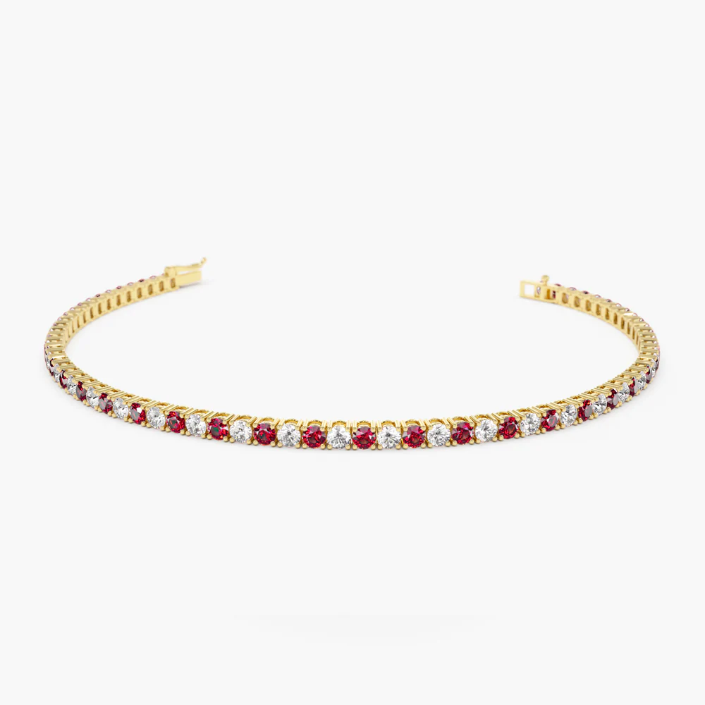 大膽的色彩與經典的光彩相遇 14K 純金爪鑲鑽石與紅寶石網球手鍊—熾熱的光芒融合 天然緬甸紅寶石 令人眼花撩亂 莫桑石鑽石圓形切割紅寶石和鑽石交錯鑲嵌,優雅別緻,鑲嵌於四爪鑲嵌底座,營造出璀璨奪目、鮮亮奪目的紅色線條。這款手鍊平衡完美,工藝精湛,是奢華與力量的永恆象徵。